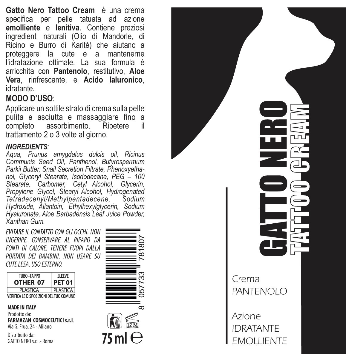 Gatto Nero Tattoo Cream è una crema specifica per pelle tatuata, ad azione emolliente e lenitiva. Formulata con principi attivi specificatamente selezionati non contiene petrolati ma preziosi ingredienti naturali (Olio di Mandorle, Olio di Ricino, Burro di Karité) che aiutano a proteggere la cute e mantenere l' idratazione ottimale. La sua formula è arricchita con Pantenolo, Aloe Vera e Acido Ialuronico.